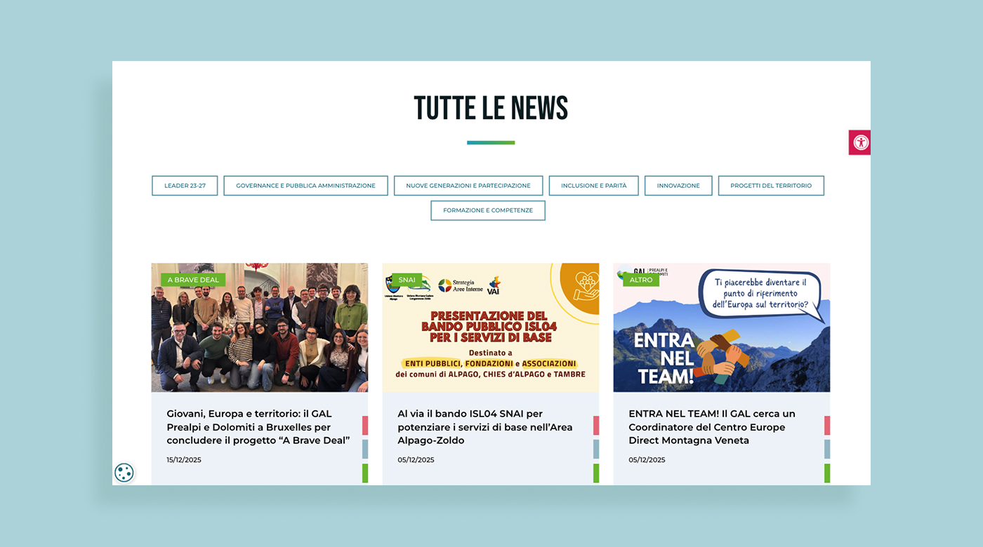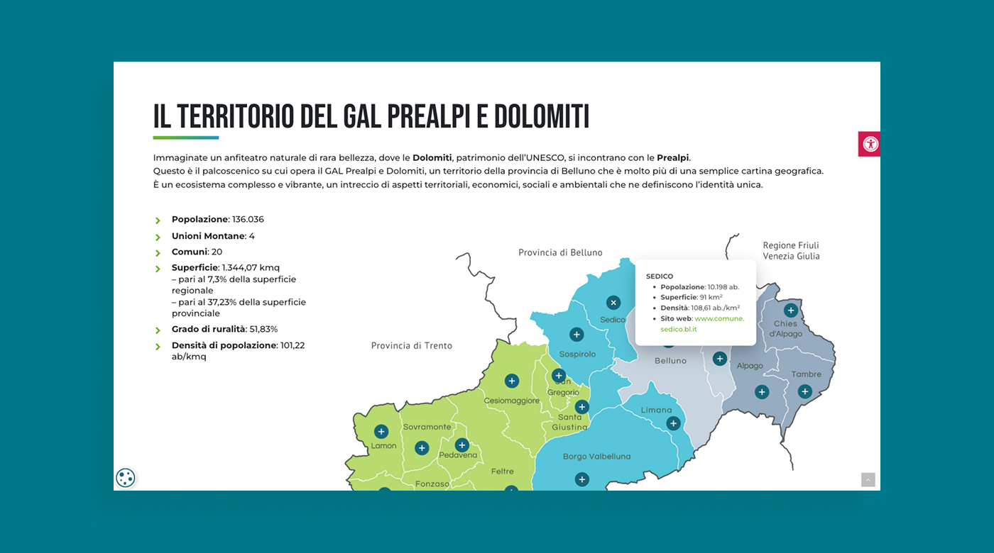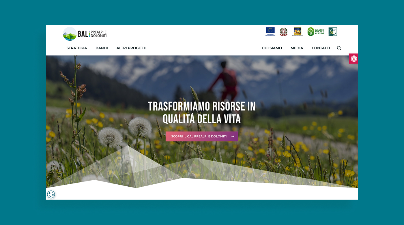 GAL Prealpi e Dolomiti è un Gruppo di Azione Locale che opera per lo sviluppo rurale e territoriale dell’area prealpina, promuovendo bandi, progetti e iniziative rivolte a enti, imprese e comunità locali. L’esigenza dell’Ente era disporre di un nuovo portale istituzionale capace di comunicare in modo chiaro le attività del GAL, valorizzare i contenuti informativi e garantire il rispetto delle normative in materia di trasparenza e accessibilità.