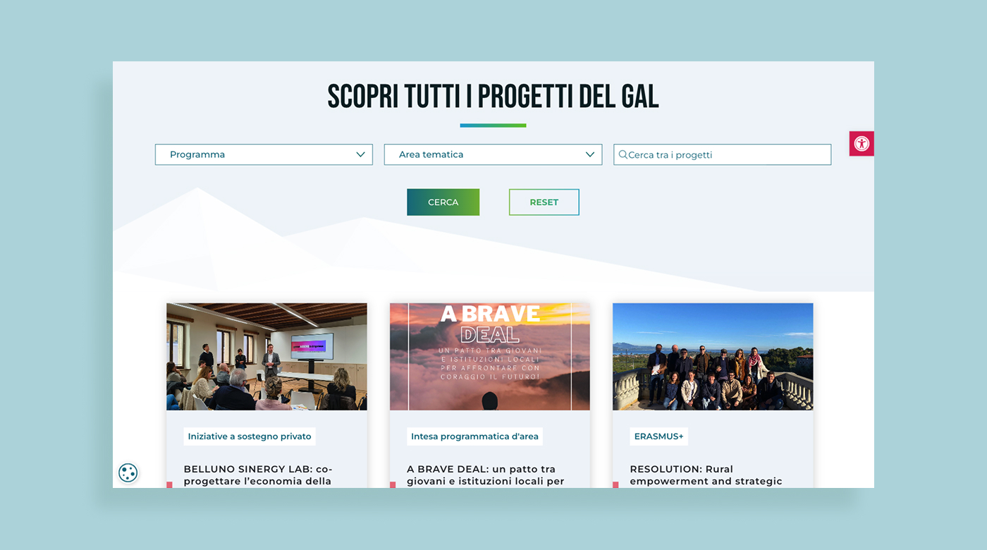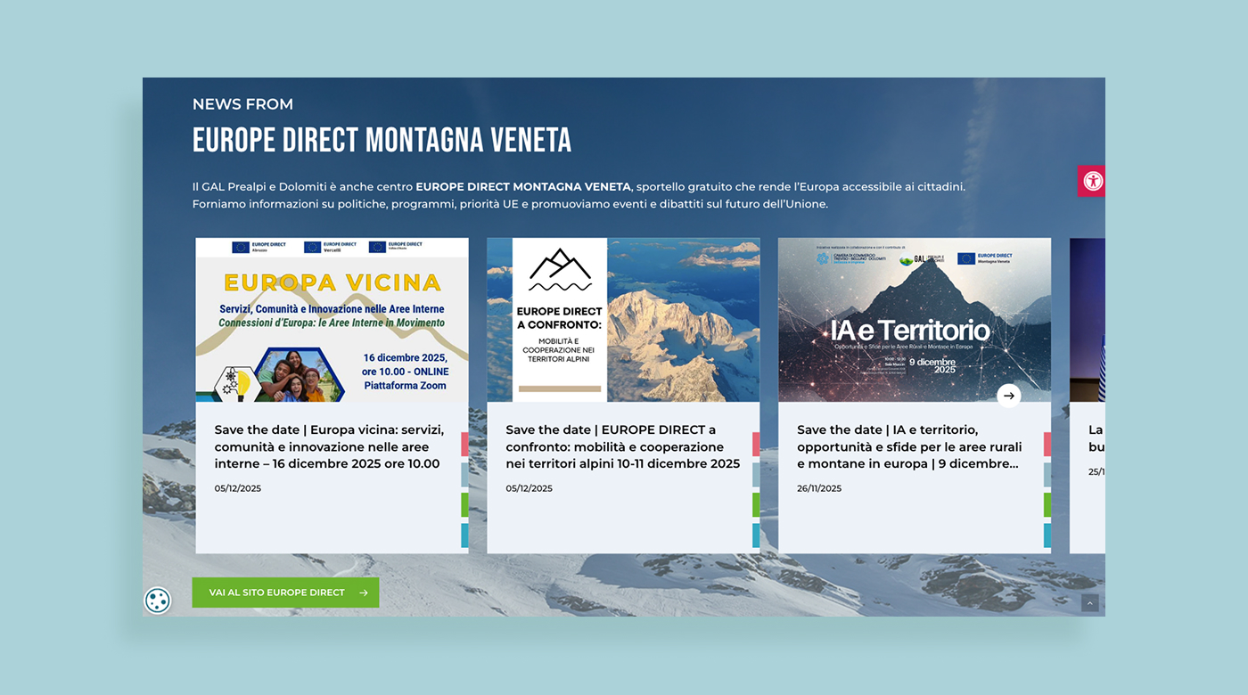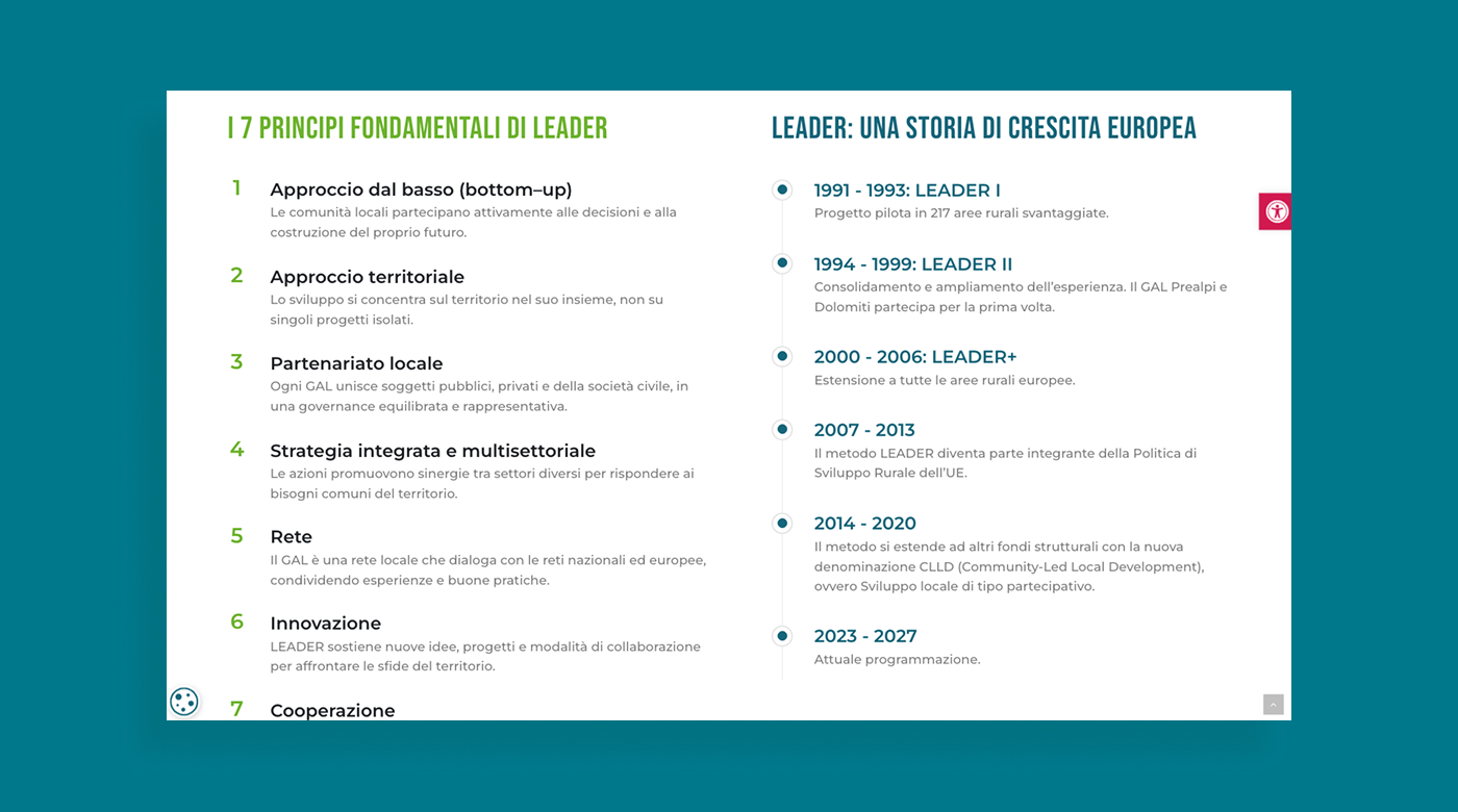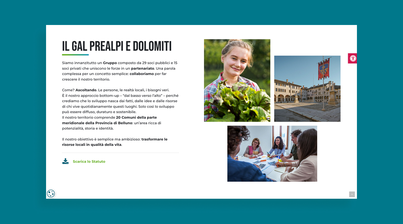 GAL Prealpi e Dolomiti è un Gruppo di Azione Locale che opera per lo sviluppo rurale e territoriale dell’area prealpina, promuovendo bandi, progetti e iniziative rivolte a enti, imprese e comunità locali. L’esigenza dell’Ente era disporre di un nuovo portale istituzionale capace di comunicare in modo chiaro le attività del GAL, valorizzare i contenuti informativi e garantire il rispetto delle normative in materia di trasparenza e accessibilità.