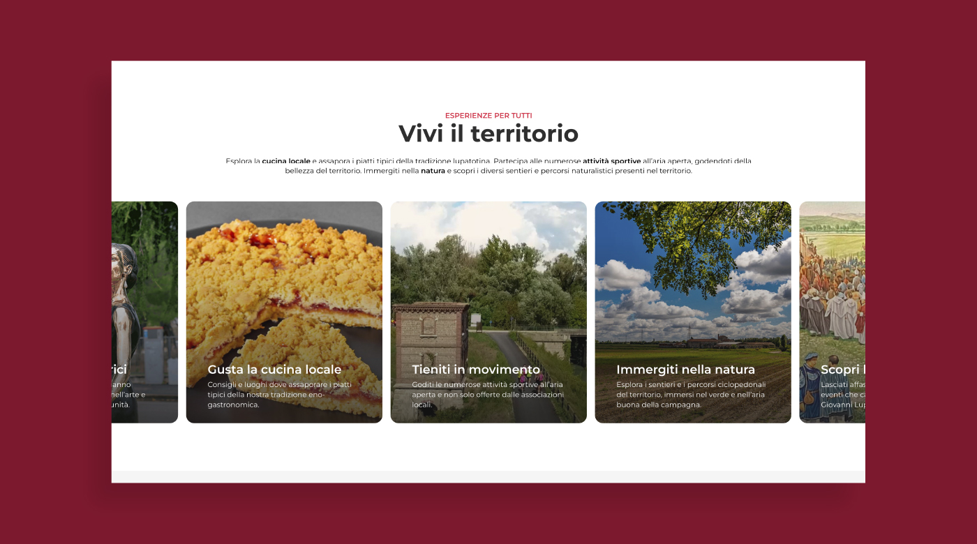 Il portale turistico è stato pensato per mettere in rete e valorizzare le risorse del territorio, promuovendo strutture ricettive, attività locali, percorsi e punti di interesse. Sono state realizzate diverse sezioni dedicate, tra cui: