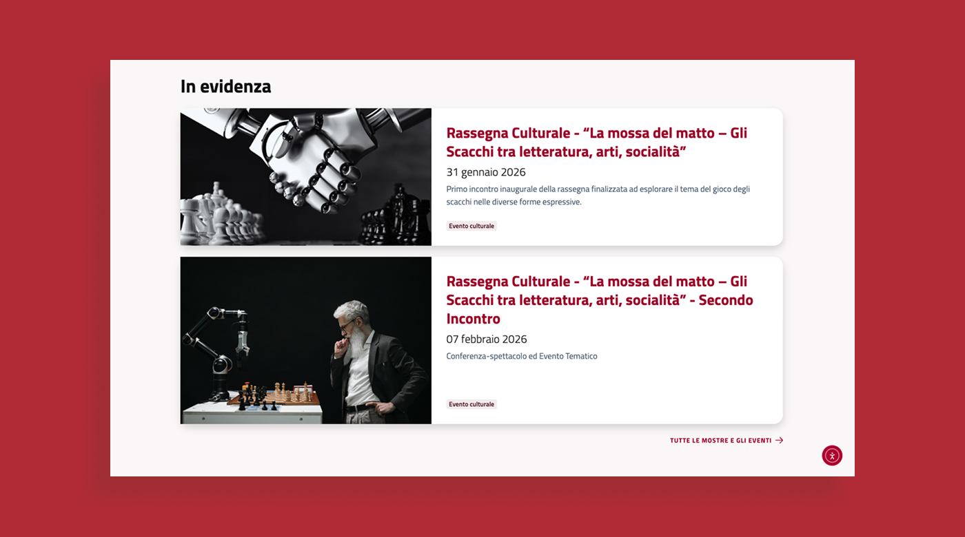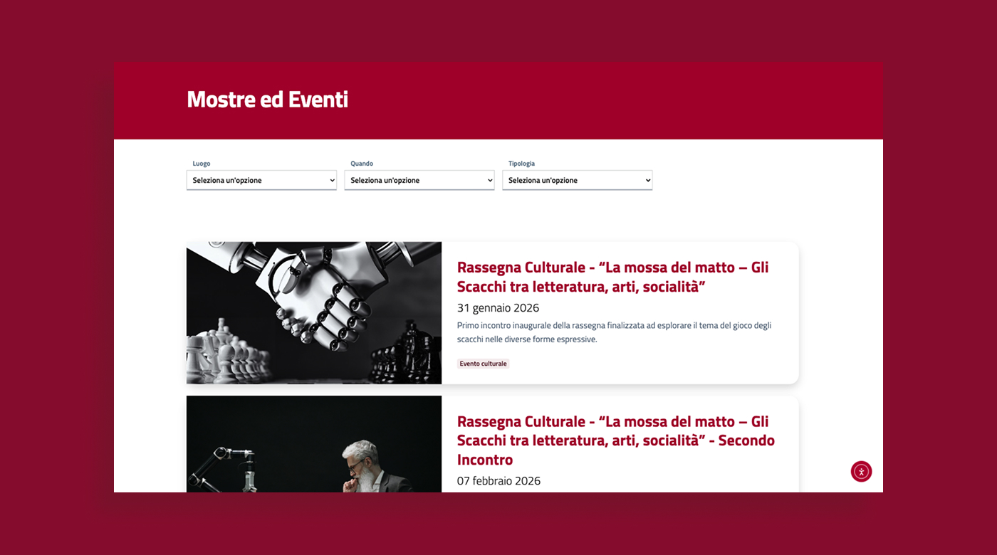 Il risultato è un portale istituzionale accessibile, conforme alle linee guida AgID della Pubblica Amministrazione e progettato per valorizzare il patrimonio museale attraverso un’esperienza di navigazione chiara e intuitiva.